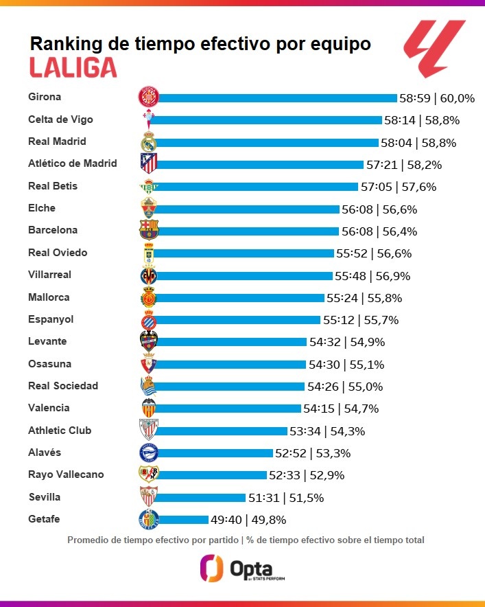 3月3日讯 Opta统计了本赛季西甲各队联赛场均比赛净时间,并列出榜单,赫罗纳居首,皇马第三、巴萨第七。